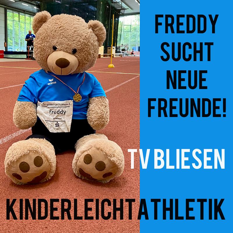 Freddy, das Maskottchen der Leichtathletikkinder des TV Bliesen, ist auf der Suche nach neuen Freundinnen und Freunden. Alle Kinder zwischen 5 und 10 Jahren sind herzlichen eingeladen, mal bei uns im Training vorbeizuschauen. Mit ganz viel Spaß könnt ihr mit uns auf spielerische Art und Weise in den Leichtathletiksport reinschnuppern. Was die wenigsten wissen… die Kinderleichtathletik ist ein MANNSCHAFTSSPORT! In Teams von bis zu 11 Kids könnt ihr euch im Laufe einer Saison in verschiedenen Wettkämpfen in den unterschiedlichsten Disziplinen messen. Z.B. Pendelstaffel, Speerwurf, Hindernislauf, Weitsprung oder Biathlon, um nur einige zu nennen. Gerade haben wir unsere Sommersaison erfolgreich beendet und sind in die vorbereitende Hallensaison gestartet. Hier werden gerade neue Teams gebildet und Grundlagen für die nächste Saison gelegt. Für „Neulinge“ also die beste Zeit, um in dieser tollen Sportart durchzustarten.